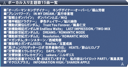 迫力ある戦闘シーンに加え、ボーカル入り主題歌15曲が収録されています